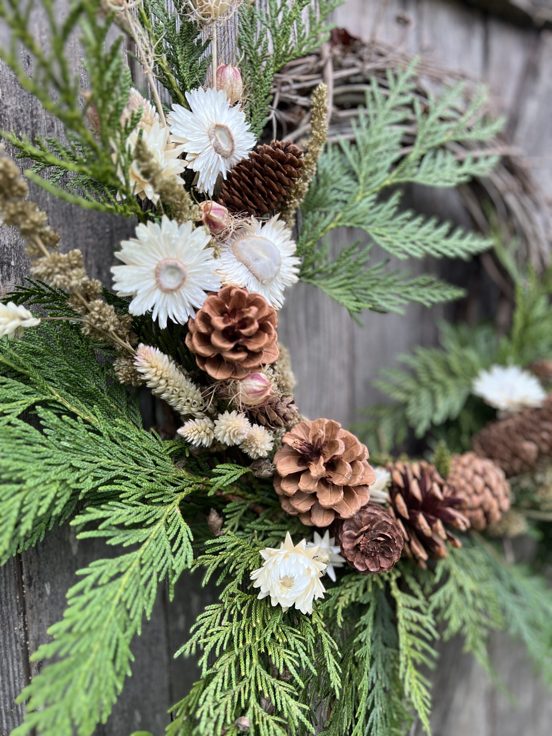 Made with a mix of fragrant western red cedar, dried strawflower, celosia, and nigella seed heads, all grown sustainably and without any harmful pesticides right here on our farm.